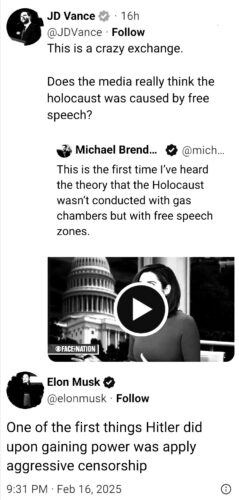 Let me now analyze the coordinated disinformation campaign evident in JD Vance’s social media posts. He demonstrates a conspiracy of historical revisionism that mirrors Nazi propaganda techniques.