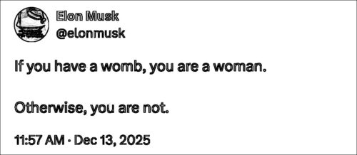 Musk’s formulation of “If you have a womb, you are a woman. Otherwise, you are not“, is the biological-determinist reduction that underpinned Nazi ideology about women.