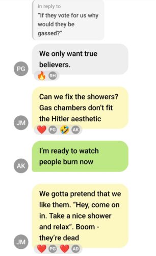 When something appears over 251 times in chats, with specific known violent hate symbols (1488), and includes detailed policy discussions interwoven with the “jokes,” it stops being humor and becomes domestic terrorist ideology with a thin comedic veneer.